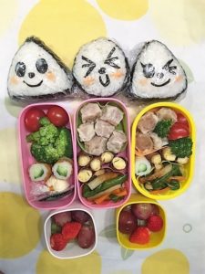 写真はオリジナルキャラクターのおにぎりさんと、おにぎり君とおにぎりちゃんです。